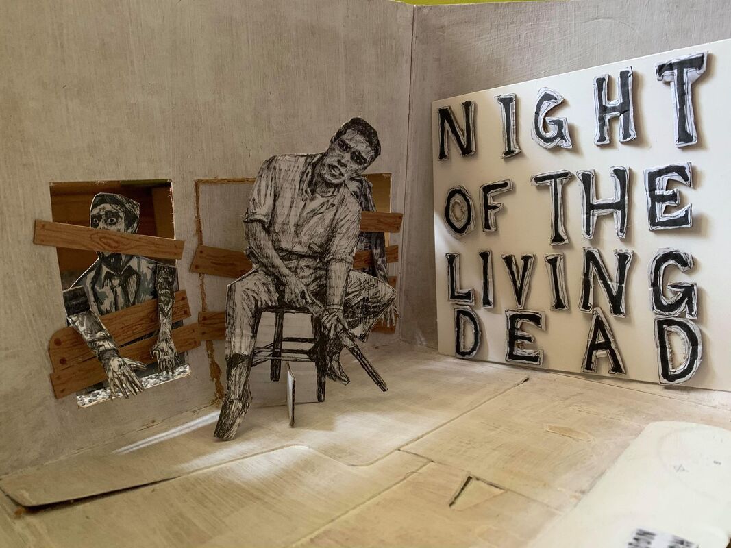 I put together a cardboard scene, boarded up the windows, made a couch. Then made cardboard Zombie figures and a figure of the main character, I then changed it cause it was too big and made one of him sitting down.
