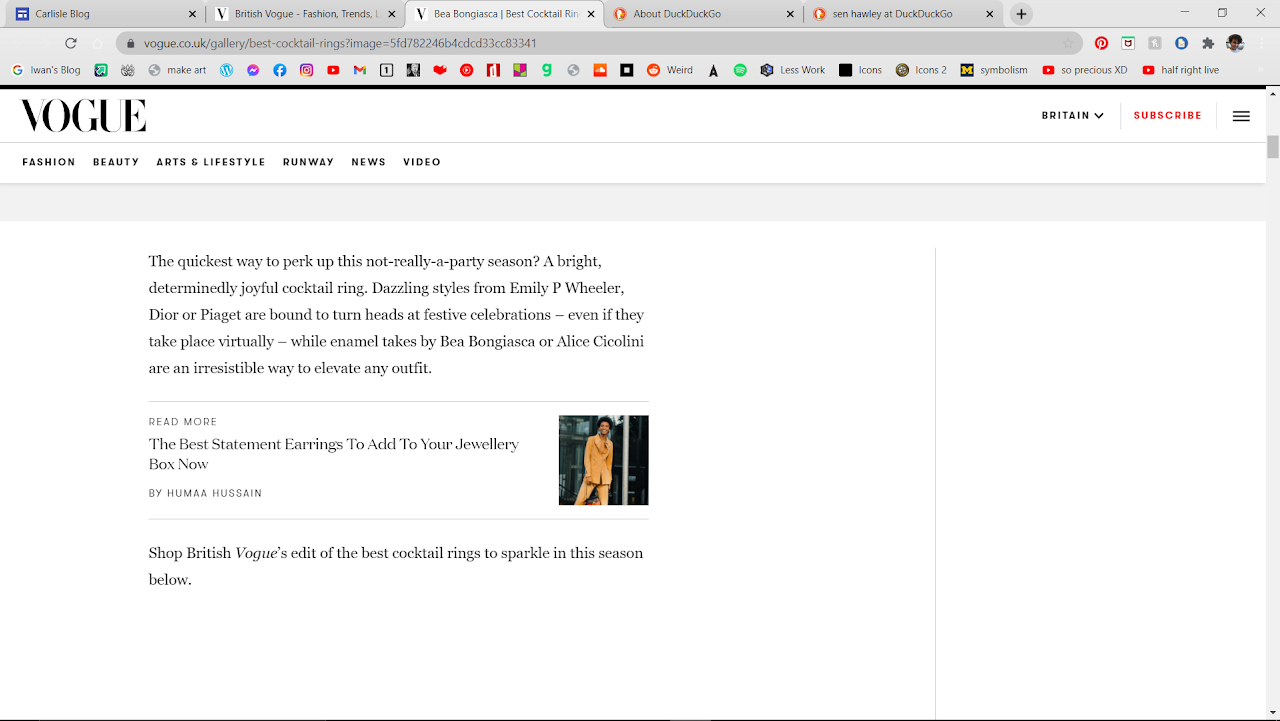 Vogue's using a serif font. Looks fancy and more upper class, then the actual non-title small print is predominantly more fancy than the last magazine, a lot more curves and serifs. This has the affect of looking fancy. The interesting part is that subheading break the mold of both fonts and look distinctly Roboto, which makes the subheadings stand out more from the contrast.