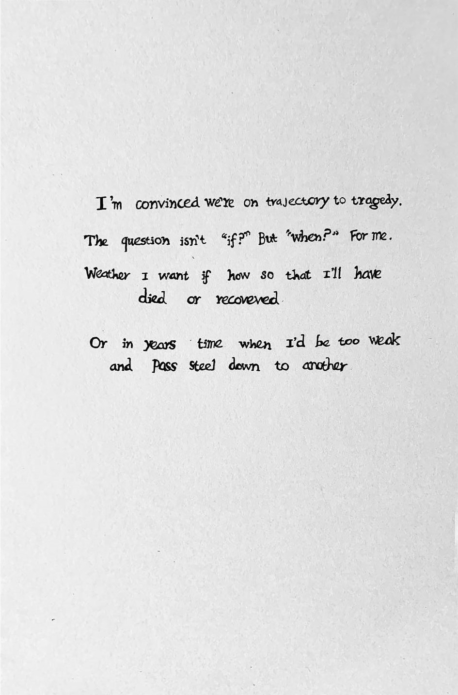 It’s to remind the viewer of how dark the ‘winter’ really can be. What it means to be in the winter period. But also hits upon another note which is the internal question I have of “well, would I prefer such a thing (if it were to happen in my life now, or later. If it happens later, I may have a family of my own… how does that change things?”