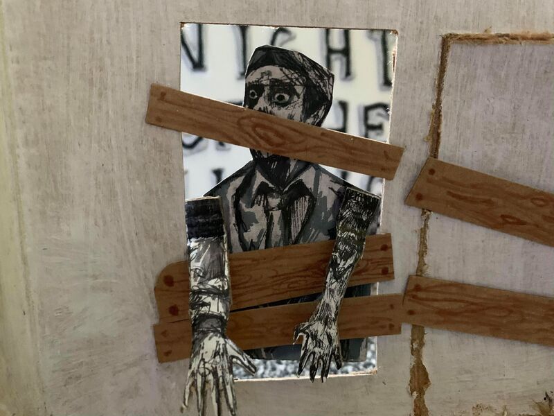 I put together a cardboard scene, boarded up the windows, made a couch. Then made cardboard Zombie figures and a figure of the main character, I then changed it cause it was too big and made one of him sitting down.