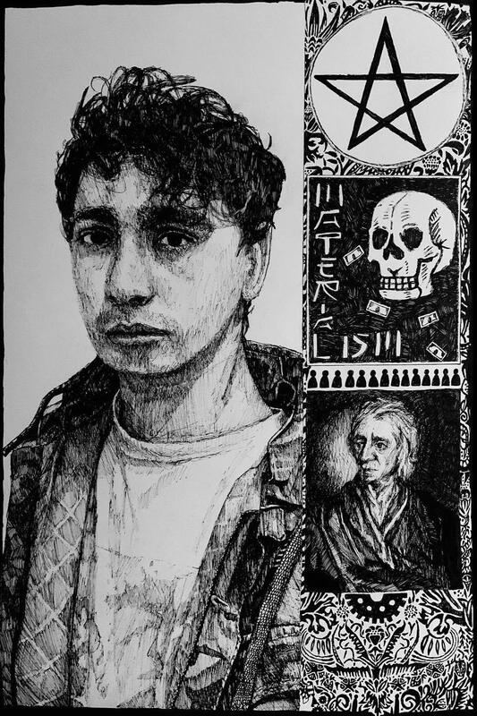 The skull’s writing says “materialism”. It’s to do with the idea that once you die, that’s it. And that all there really is, is material possessions and things.