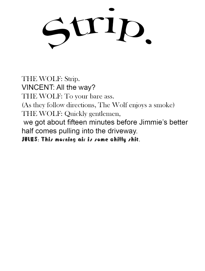 THE WOLF: Like a couple of guys who just blew off somebody’s head. Yes, stripping’ off those bloody rags is absolutely necessary. Toss the clothes in Jim’s garbage bag.